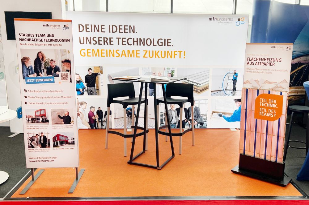 Auf der Jobmesse Osnabrück war mfh systems in diesem Jahr erstmals als Aussteller vertreten. Das Unternehmen stellte seine Tätigkeitsbereiche sowie seine Innovationskraft im Bereich moderner Flächenheizungs-, Kühl- und Lüftungssysteme vor. Interessierte Besucherinnen und Besucher hatten die Gelegenheit, sich über Ausbildungs- und Einstiegschancen sowie die Unternehmenskultur zu informieren.