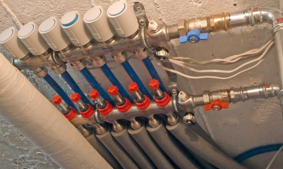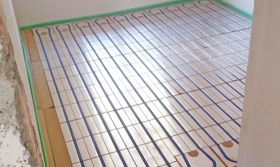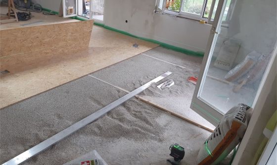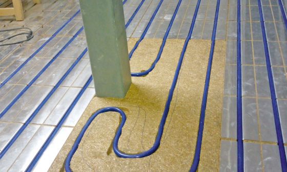 Im Erdgeschoss wurde eine Sanierung durchgeführt, die jedoch keine energetischen Maßnahmen beinhaltete. Um einen ebenen Untergrund zu schaffen, kam eine Ausgleichsschüttung zum Einsatz. Diese wurde mit 15 mm starken OSB-Platten belegt. Darauf erfolgte die Verlegung des Heizsystems IDEAL CLASSIC ÖKO ST 30 in Verbindung mit der Wärmeleitschicht COMPACT FLOOR PRO 12. Die Vorlauftemperatur der Fußbodenheizung beträgt 35 °C.